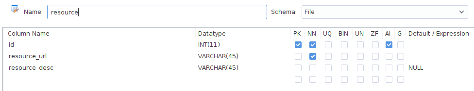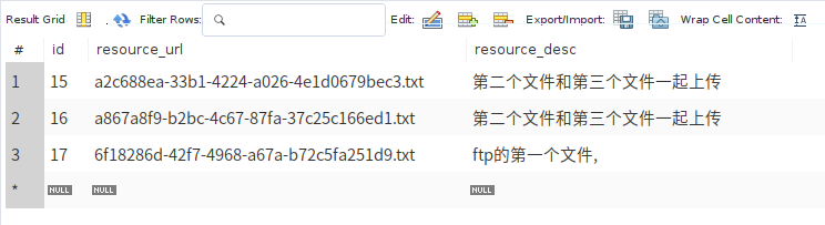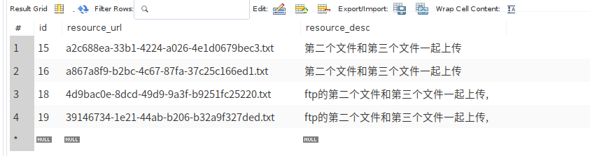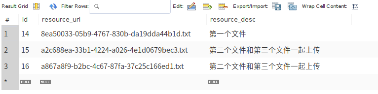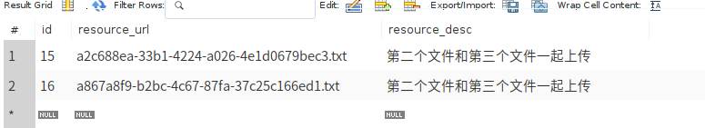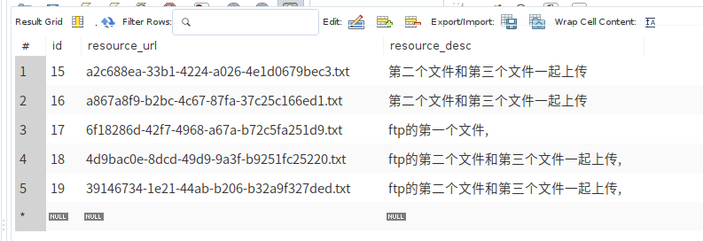 (这里说的本地服务器是指项目部署所在服务器且文件存放在与jar包同级的static的File目录下) 1.创建名为File的数据库(这里使用mysql数据库),并添加resource表,此表将记录所有文件信息,其中有主键id,文件名resource_url以及文件描述resource_desc字段。如下图:
