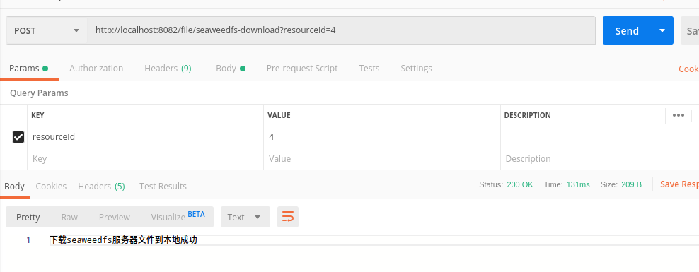 1 2 3 4 5 6 7 8 9 10 11 12 13 14 15 16 17 18 19 20 21 22 23 24 25 @PostMapping("/seaweedfs-upload") public String seaweedfsUpload (@RequestParam("file") MultipartFile file, ResourceDTO resourceDTO) { int resourceId=seaweedfsService.uploadSeaweedfsResource(file,resourceDTO); return "上传文件到seaweedfs服务器成功,此文件的id为:" + resourceId; } @PostMapping("/seaweedfs-download") public String seaweedfsDownload (Integer resourceId) { SeaweedfsDO seaweedfsDO=seaweedfsService.getResourceById(resourceId); boolean success = seaweedfsService.downloadSeaweedfsResource(seaweedfsDO.getFileName(),seaweedfsDO.getFileUrl()); if (success){ return "下载seaweedfs服务器文件到本地成功" ; } return "下载seaweedfs服务器文件到本地失败" ; } @PostMapping("/seaweedfs-delete") public String seaweedfsDelete (Integer resourceId) { SeaweedfsDO seaweedfsDO=seaweedfsService.getResourceById(resourceId); boolean success = seaweedfsService.DeleteSeaweedfsResource(seaweedfsDO.getFileUrl(),resourceId); if (success){ return "删除在seaweedfs服务器的文件成功" ; } return "删除在seaweedfs服务器的文件失败" ; }