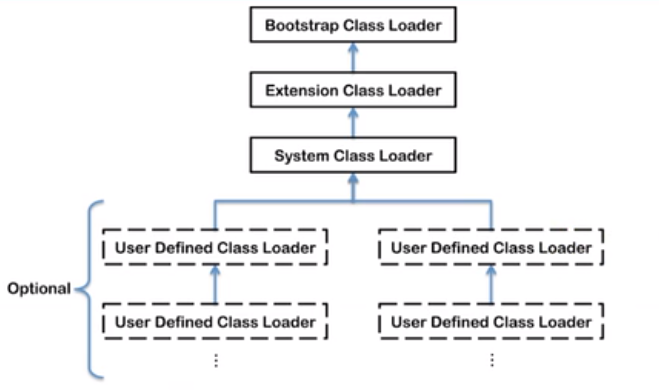 - 如果父类加载器还存在其父类加载器,则进一步向上委托,请求最终达到顶层的启动类加载器。
