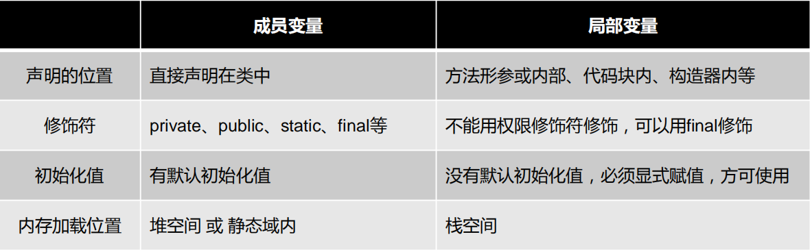 • 局部变量:声明在方法内、方法形参、代码块内、构造器形参、构造器内部的变量。