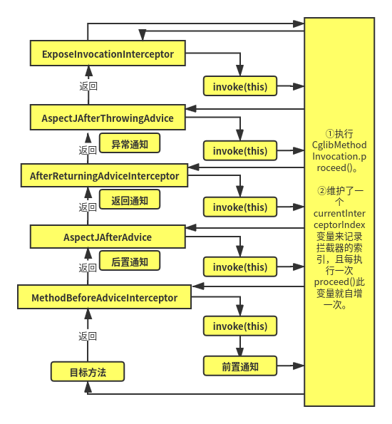 + ①链式获取每一个拦截器,拦截器执行invoke方法,每一个拦截器等待下一个拦截器执行完成返回以后再来执行(递归调用),**拦截器链的机制,保证通知方法与目标方法的执行顺序**。五个拦截器的信息如下: