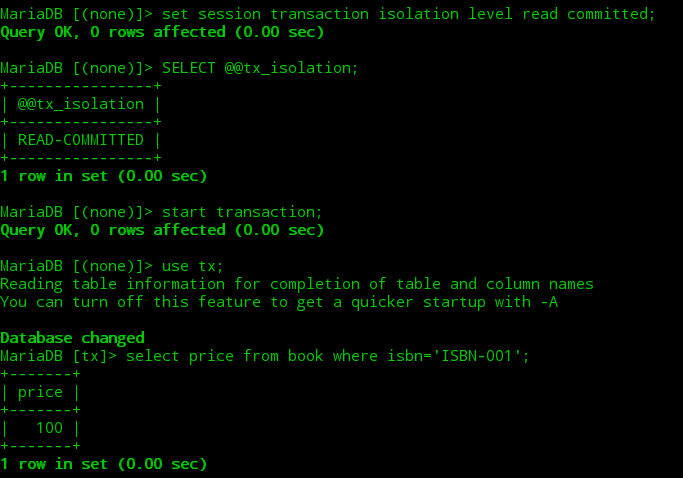 ①打开第一个终端,开启一个mysql会话并修改当前会话的隔离级别为“读已提交”,接着开启一个事务查询到图书表中ISBN-001图书的初始价格为100。