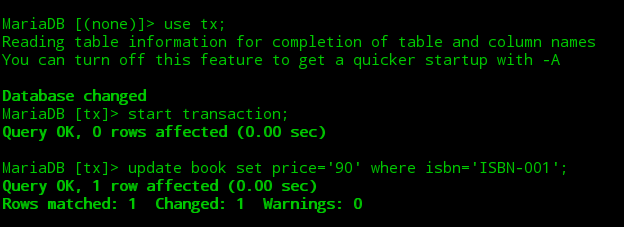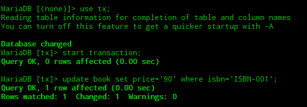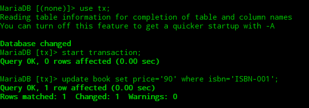②打开第二个终端,开启一个mysql会话并开启一个事务将图书表中ISBN-001图书的价格更改为90,此时当前事务并未提交。