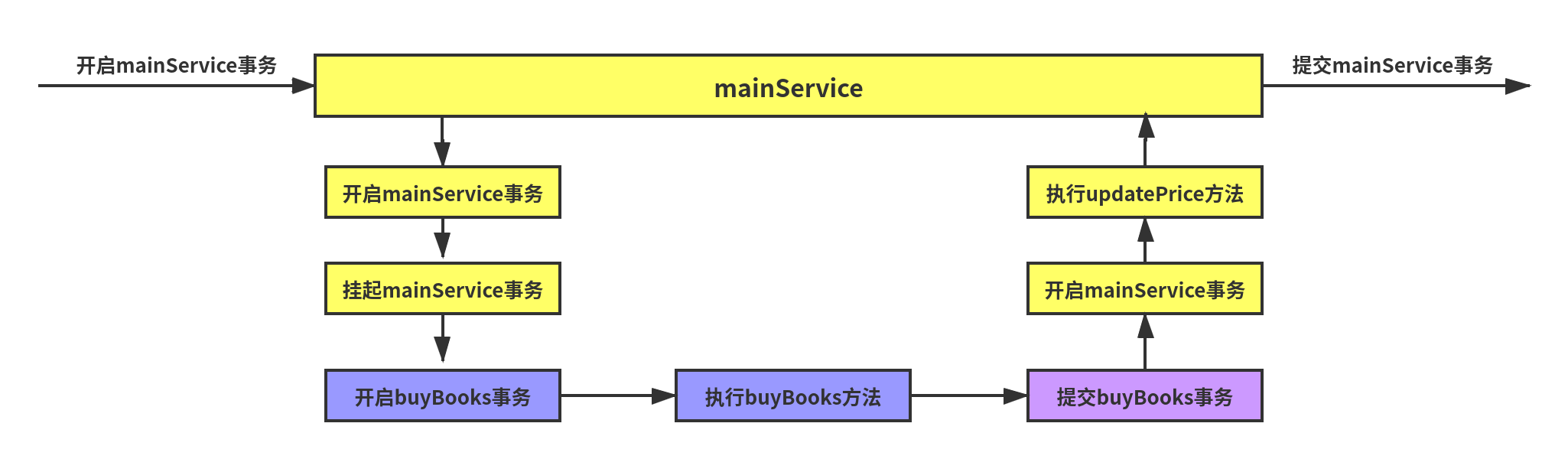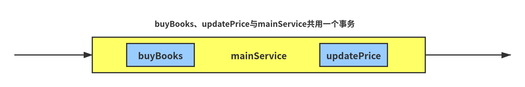 }测试结果发现三个事务方法对数据库的操作全部回滚了,原因是bookService中的两个事务方法都设置成Propagation.REQUIRED,而它们都被MainService中的方法所调用(此方法也开启了事务),导致这三个方法公用一个事务,一旦一个地方执行出错则全部回滚。(注意:由于两个小事务和大事务公用一个事务,则两个小事务设置的其它属性不生效,其共有的属性应该在大事务中设置)