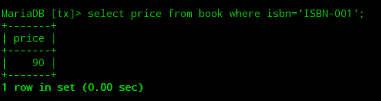 ①打开第一个终端,开启一个mysql会话,接着开启一个事务查询到图书表中ISBN-001图书的初始价格为100,紧接着修改价格为90。