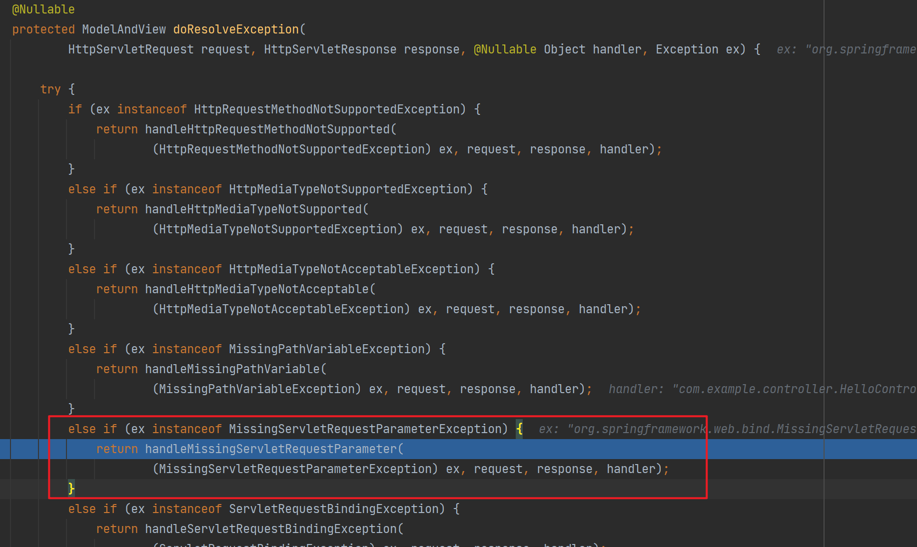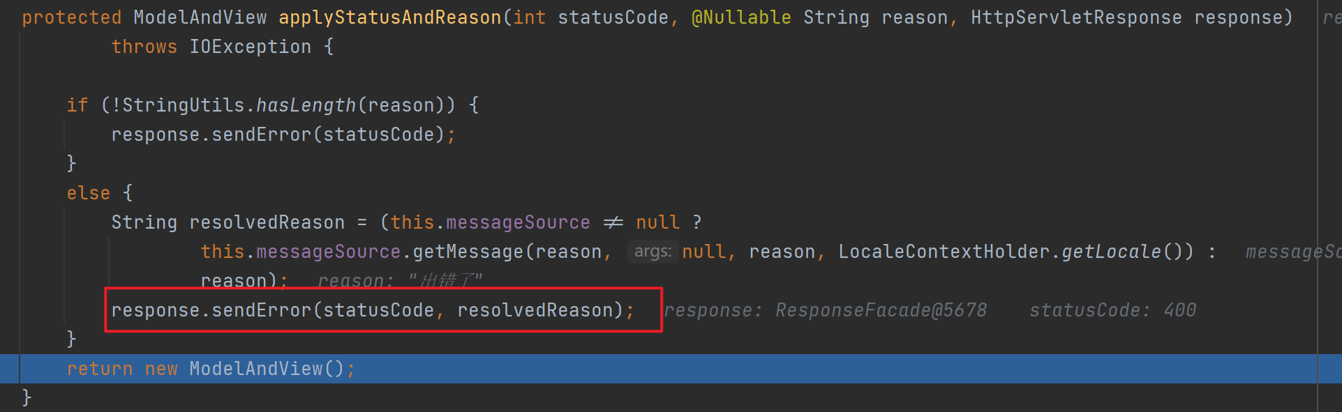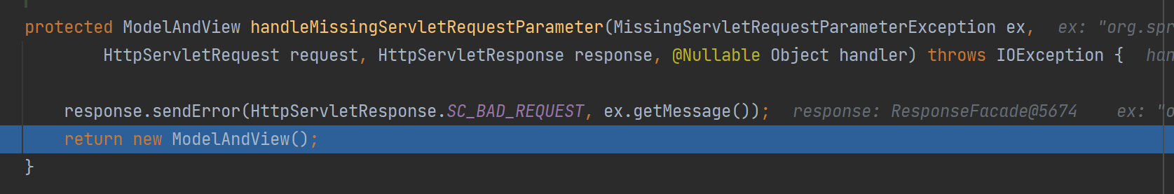 ③如果出现了SpringMVC框架底层的异常(例如上面列举的MissingServletRequestParameterException异常),则是由DefaultHandlerExceptionResolver来处理的。它会在doResolveException()中判断当前抛出的异常是否是框架底层的异常之一,如果是则进入对应的处理异常的方式并返回一个ModelAndView对象。这里以出现了MissingServletRequestParameterException为例,会调用handleMissingServletRequestParameter()–>response.sendError()使此次请求立即结束并转发出/error请求将错误信息发给tomcat来响应错误页面,最后创建一个空的ModelAndView对象后返回。
