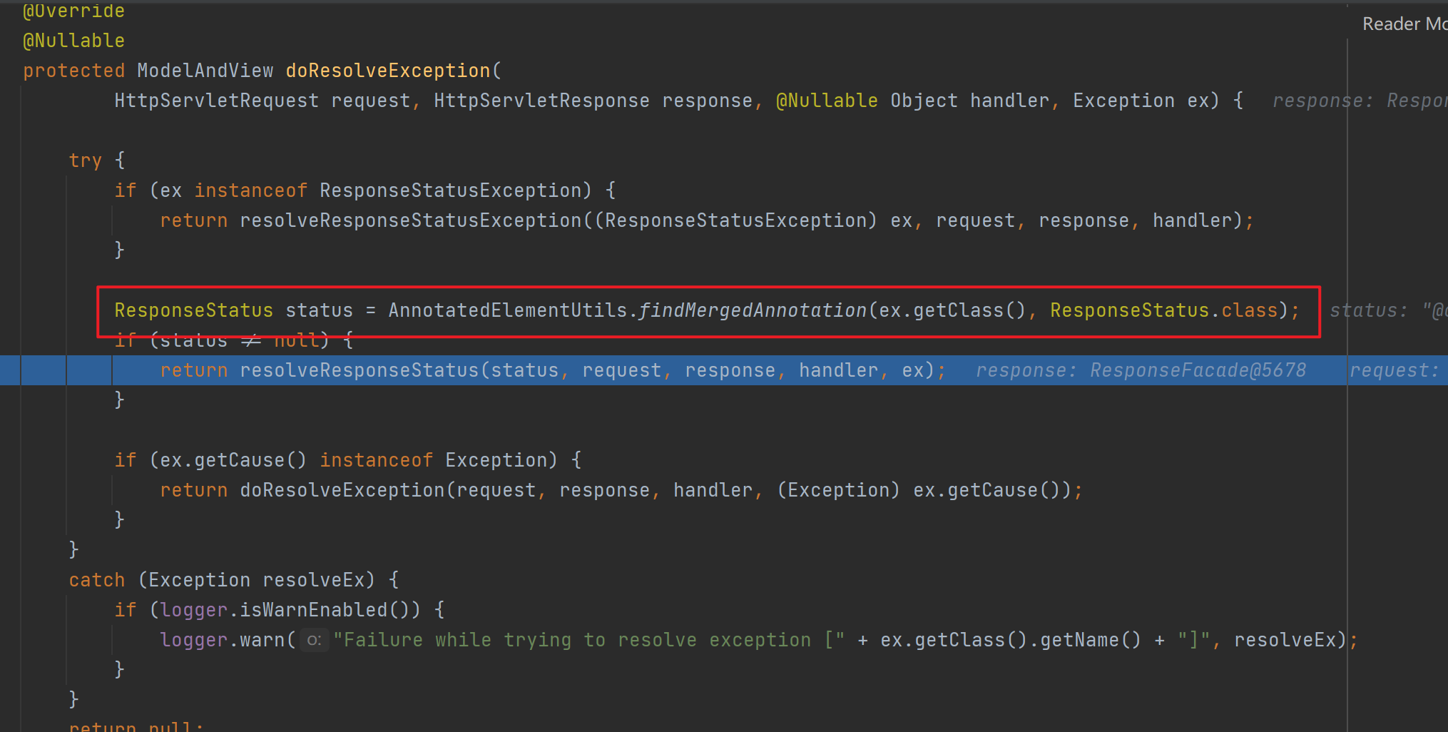 ②如果是基于@ResponseStatus注解的异常处理方式,则是使用ResponseStatusExceptionResolver来处理的,它会在doResolveException()中判断当前抛出的异常是否标了@ResponseStatus注解,如果是则通过接连调用resolveResponseStatus()–>applyStatusAndReason()–>response.sendError()使此次请求立即结束并转发出/error请求将错误信息发给tomcat来响应错误页面,最后创建一个空的ModelAndView对象后返回。