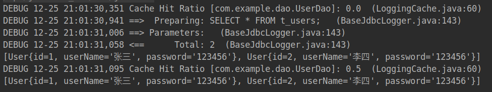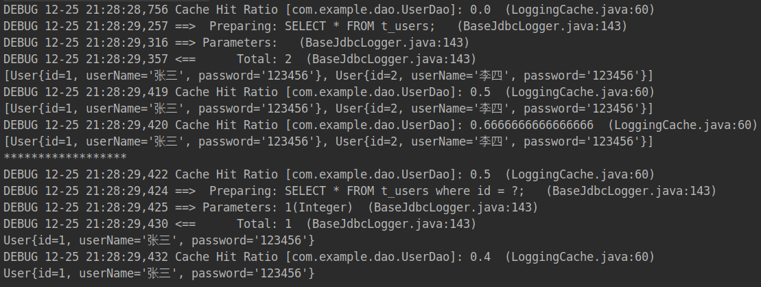 }执行结果如下,可见第二次查询是从一级缓存中获取的: