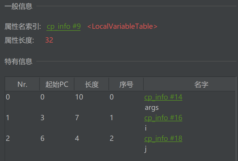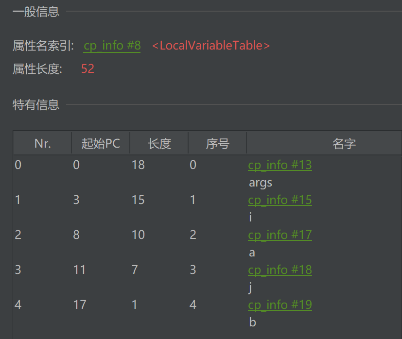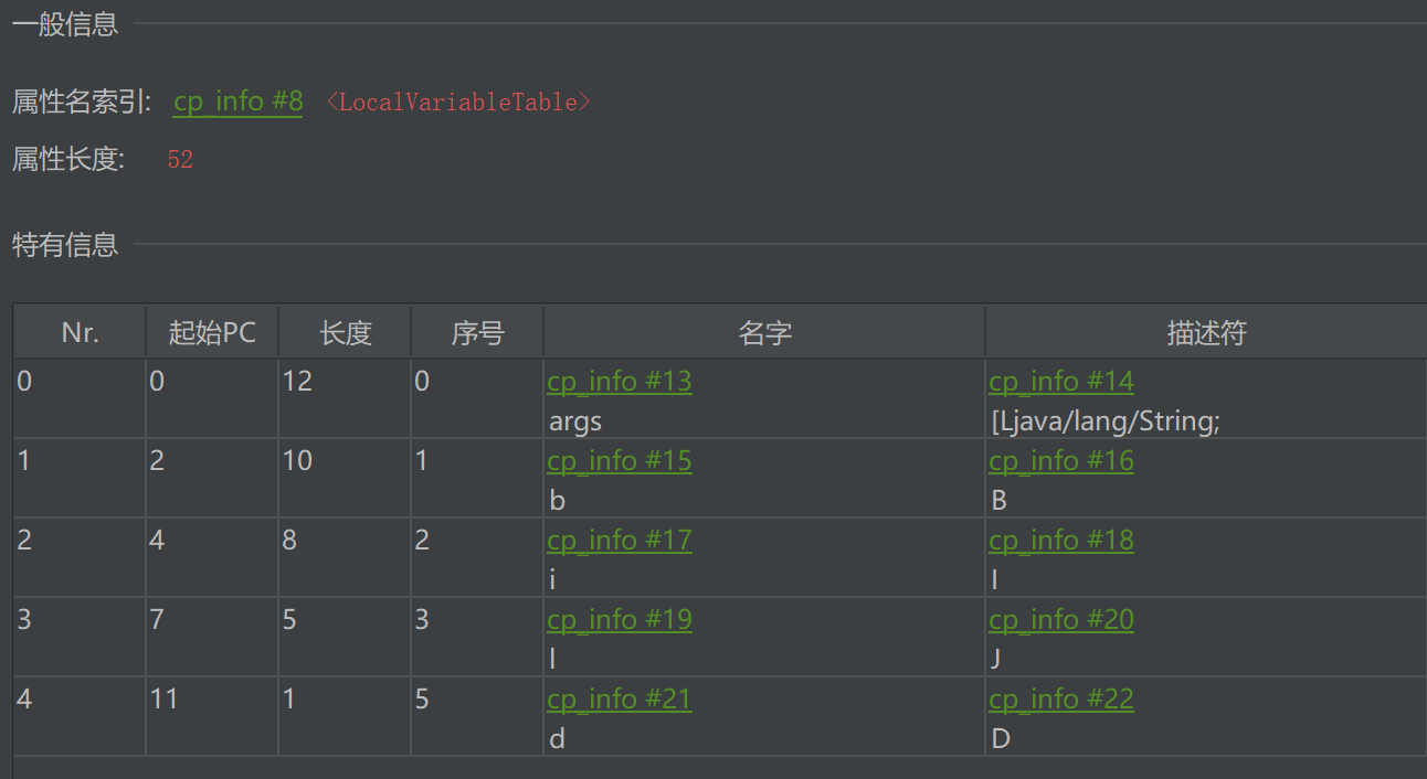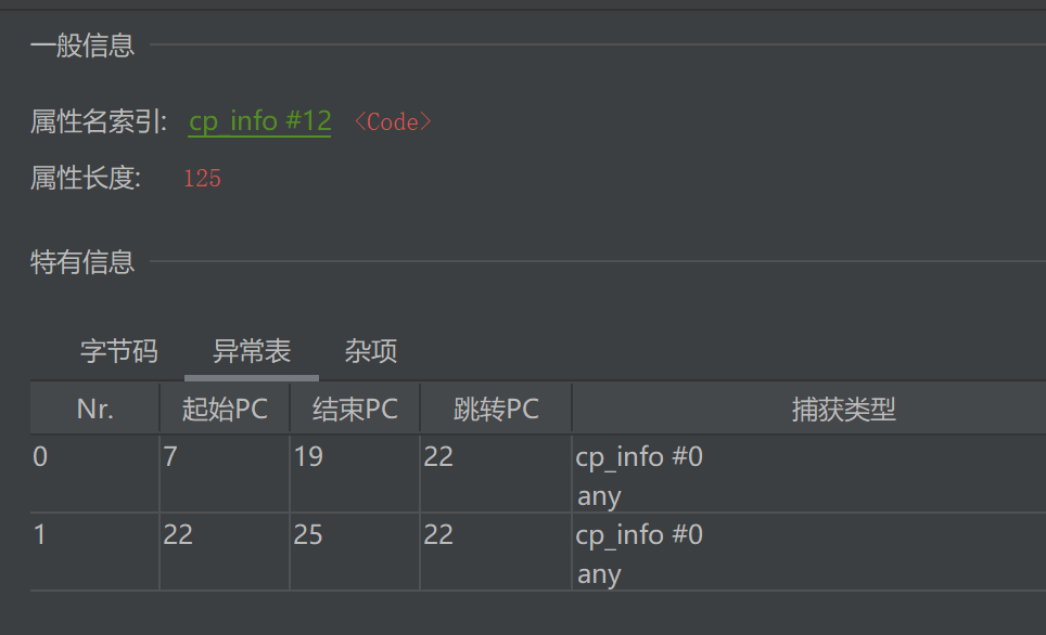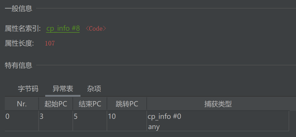 - 如果一个方法定义了一个try-catch或者try-finally的异常处理,就会创建一个异常表。它包含了每个异常处理或者finally块的信息。异常表保存了每个异常处理信息。比如: