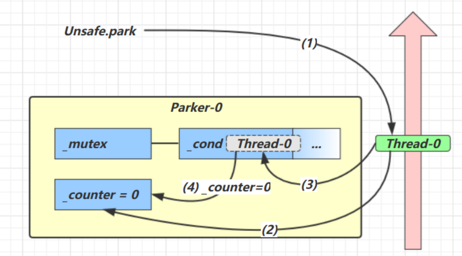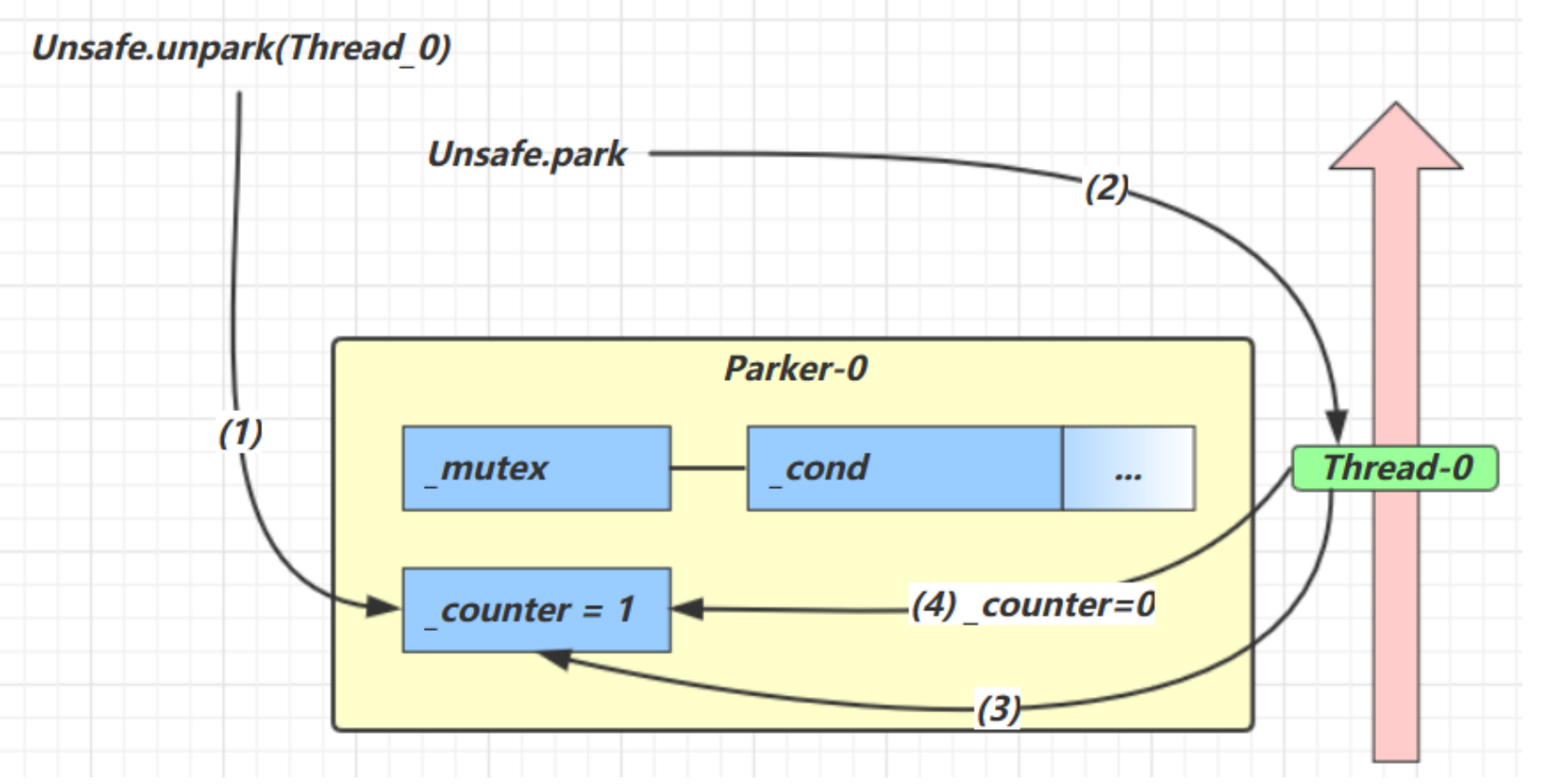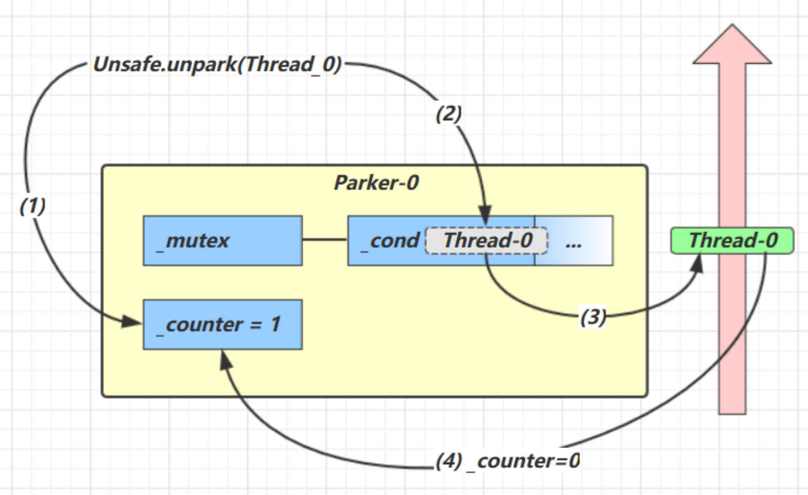 - ①调用Unsafe.unpark(Thread_0)方法,设置_counter为1。