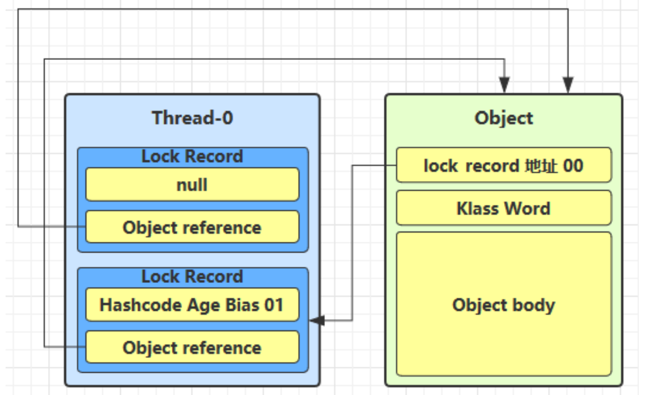 - 当Thread-1进行轻量级加锁时,Thread-0已经对该对象加了轻量级锁。