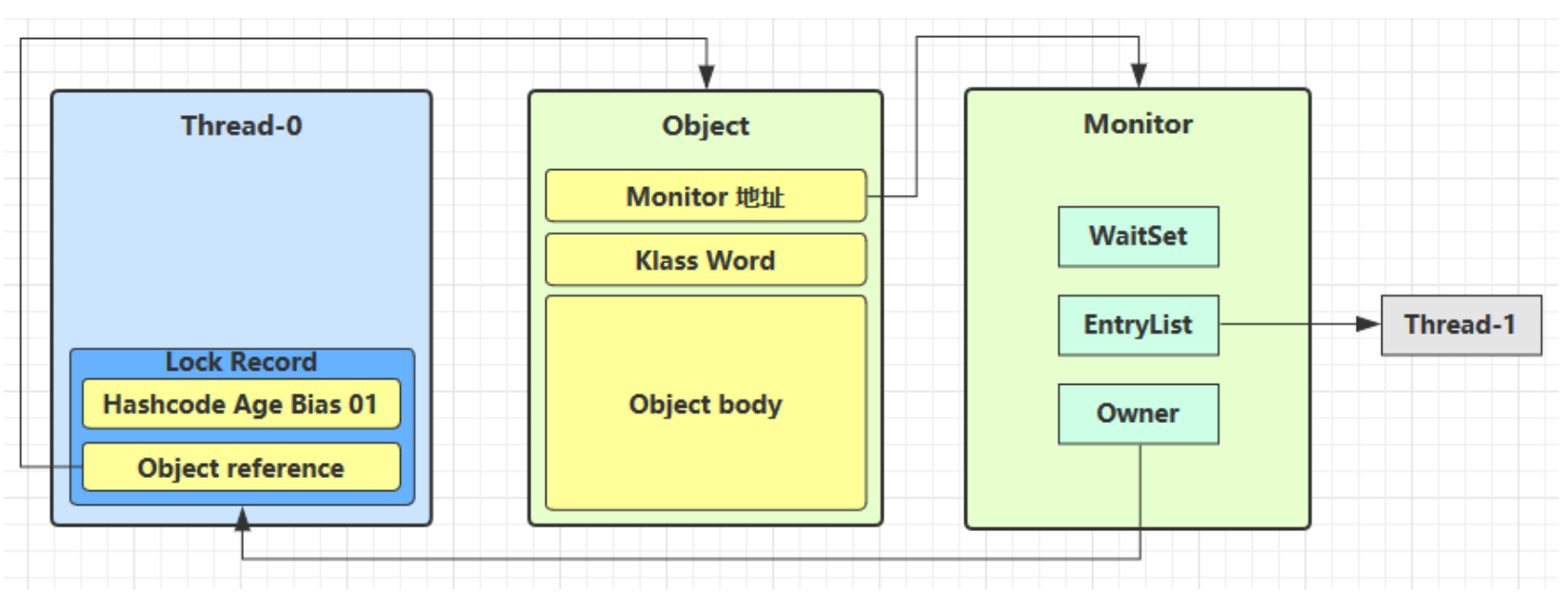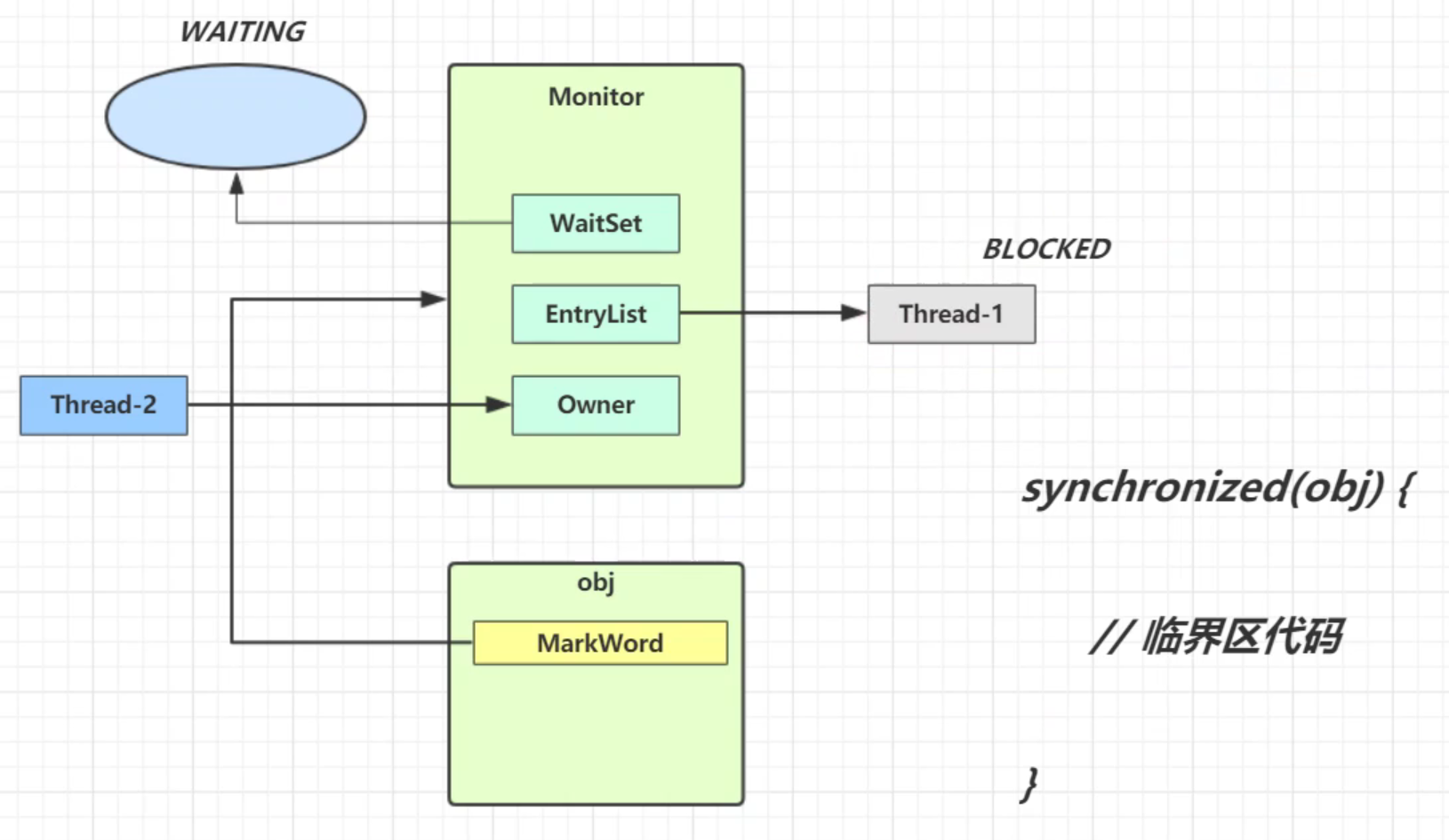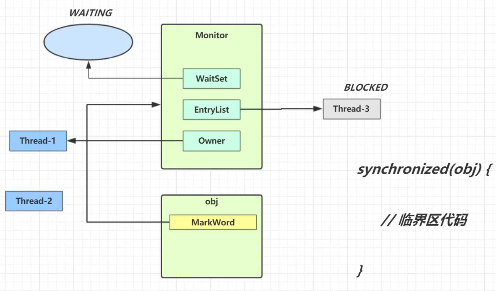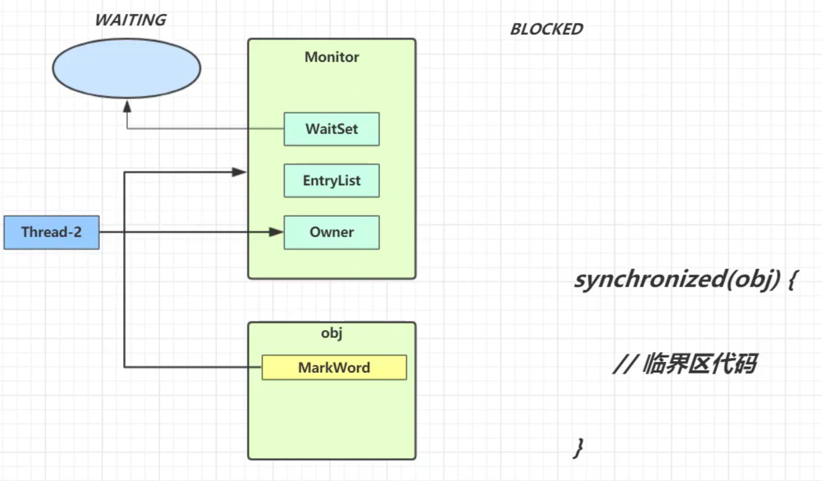 ②这时如果另一个线程Thread1也要来执行临界区代码,它会先检查obj是否已经关联了一个Monitor对象,如果是则进一步检查它指向的Monitor对象是否有Owner,如果有则线程Thread1会进入Monitor对象的EntryList(等待队列)中,此时它变成blocked状态直至Owner被释放。