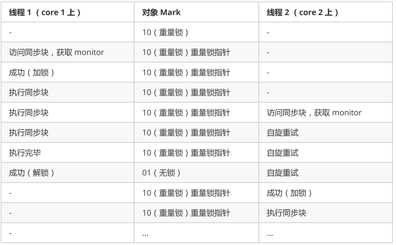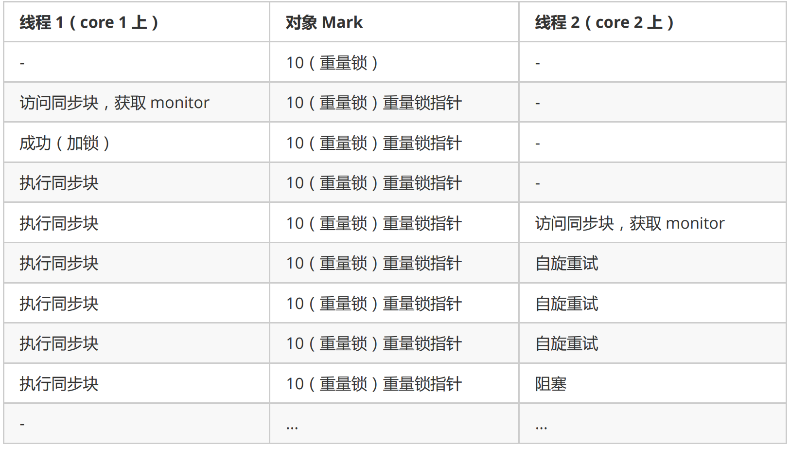 重量级锁竞争的时候,还可以使用自旋来进行优化,如果当前线程自旋成功(即这时候持锁线程已经退出了同步块,释放了锁),这时当前线程就可以避免阻塞。