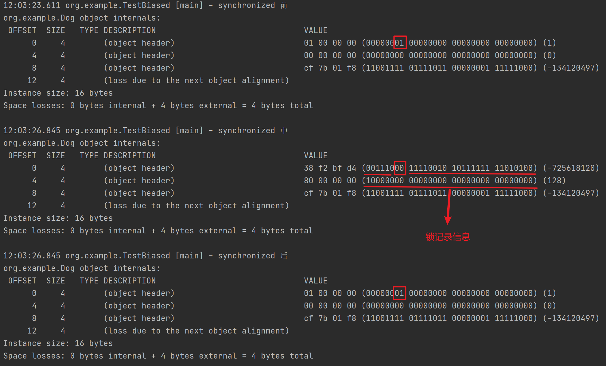 ⑤紧接着t3线程后面的第20至39次打印是将处于偏向锁状态的锁对象分别变成轻量级锁,并在解锁后变成正常状态。