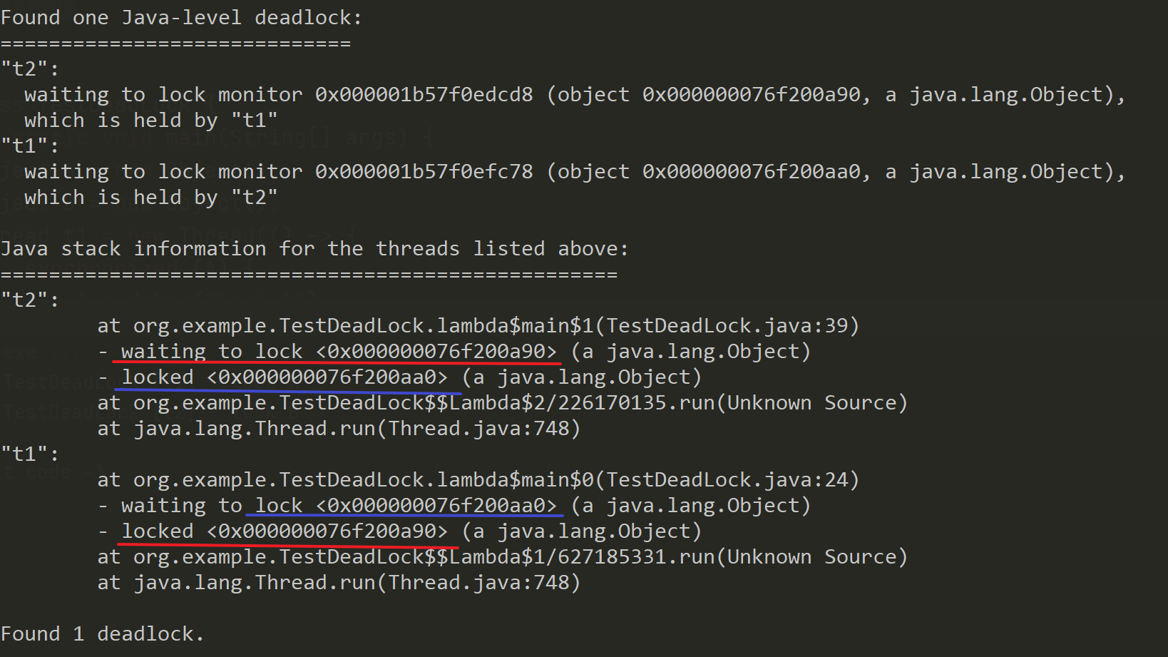第一种方式:运行程序,打开终端运行jps,使用jps定位进程id,再用【jstack+进程id】定位死锁。打印信息如下: