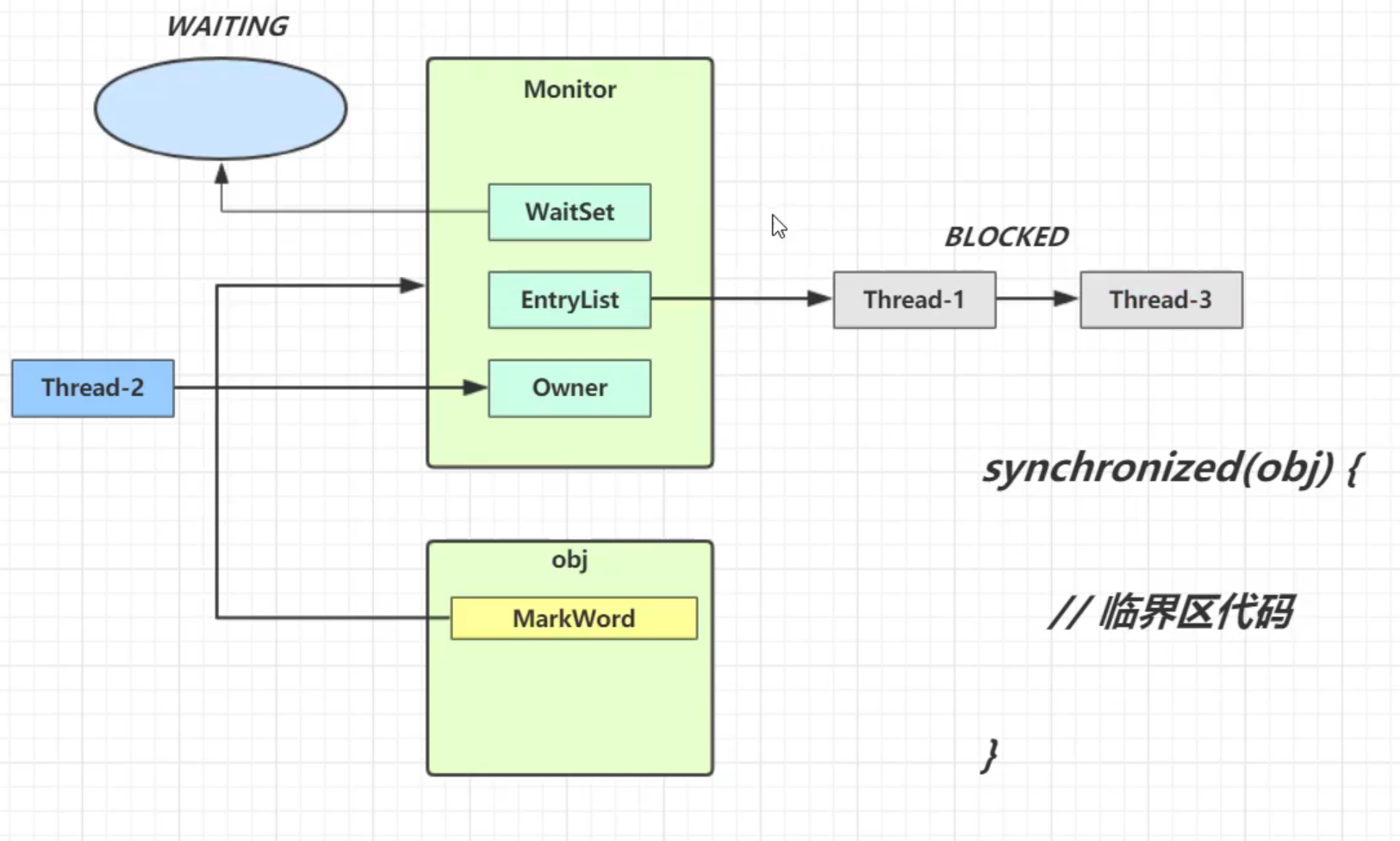 ③同理,如果紧接着Thread-3也来执行synchronized(obj),也会进入EntryList中阻塞,EntryList是一个链表结构。