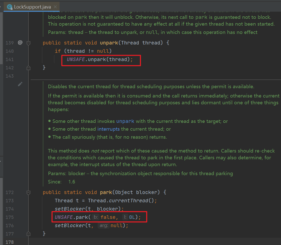 Unsafe对象不能直接调用,只能通过反射获得。CAS和LockSupport的park/unpark方法底层都是调用Unsafe对象的相关方法实现的。