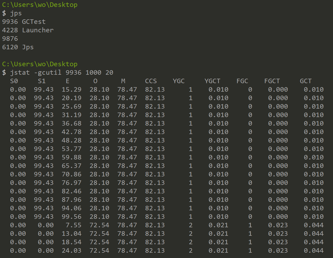-gcutil:显示内容与-gc基本相同,但输出主要关注己使用空间占总空间的百分比。运行程序后测试结果如下: