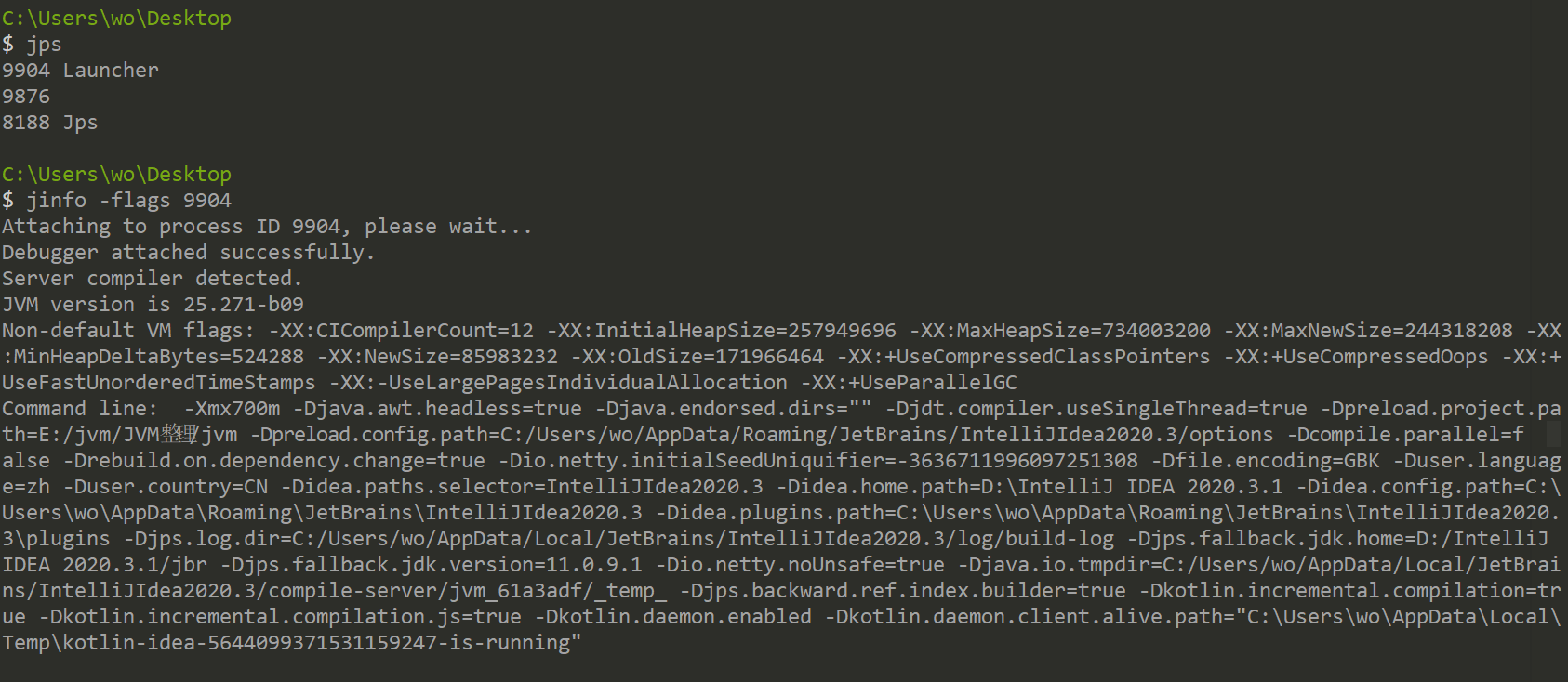 java -XX:+PrintCommandLineFlags:查看那些已经被用户或者JVM设置过的详细的XX参数的名称和值。