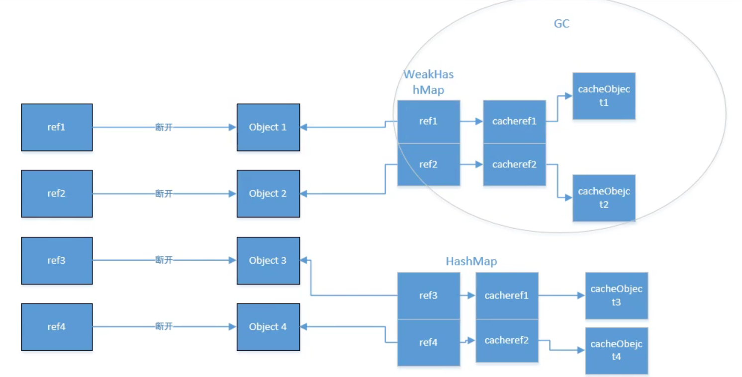 上面代码和图示演示WeakHashMap如何自动释放缓存对象,当init函数执行完成后,局部变量字符串引用weakd1,weakd2,d1,d2都会消失,此时只有静态map中保存中对字符串对象的引用,可以看到,调用gc之后,HashMap的没有被回收,而WeakHashMap里面的缓存被回收了。