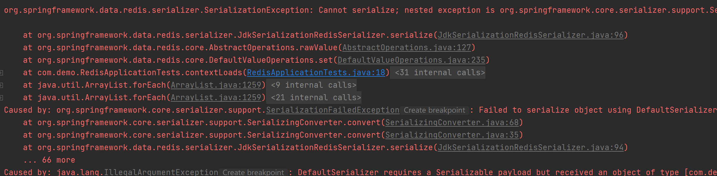 下面验证redis中存储的对象必须经过序列化,否则会抛出序列化异常SerializationException。