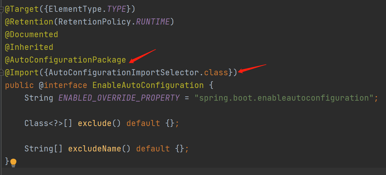 - @EnableAutoConfiguration:包含两个重要注解@AutoConfigurationPackage和@Import({AutoConfigurationImportSelector.class})。