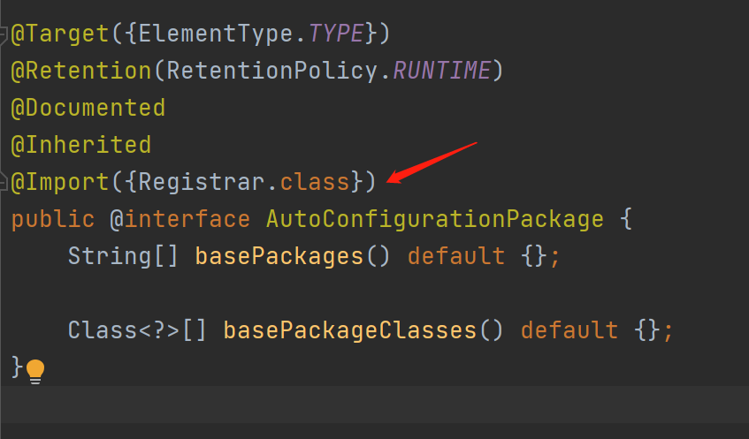 - @AutoConfigurationPackage:将Registrar类导入到容器中,而Registrar类作用是扫描主配置类同级目录以及子包,并将相应的组件导入到springboot创建管理的容器中。