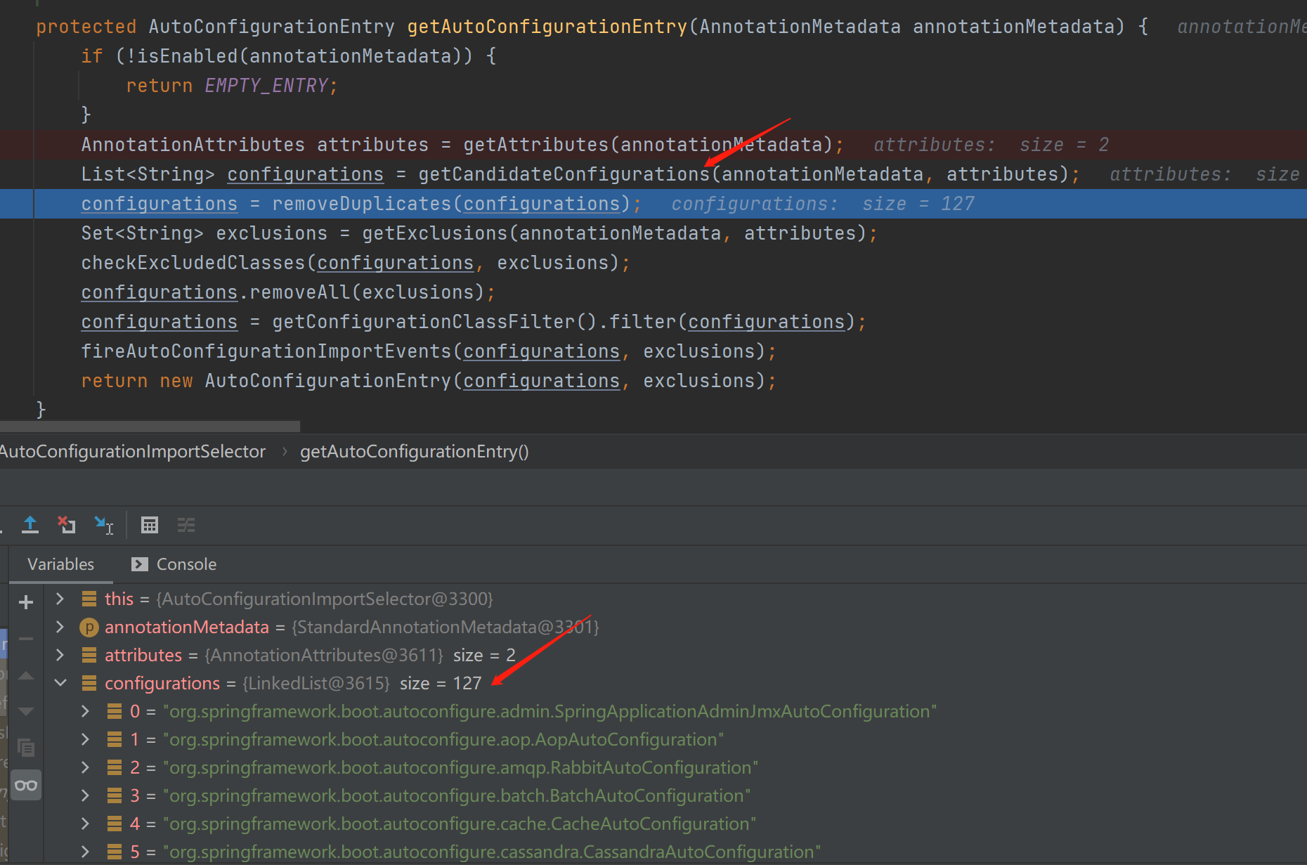getAutoConfigurationEntry()通过调用getCandidateConfigurations()获取到所有需要导入到容器中的配置类。虽然所有配置类在启动的时候默认全部加载(xxxxAutoConfiguration),但最终会按照条件装配规则(@Conditional)进行按需配置。