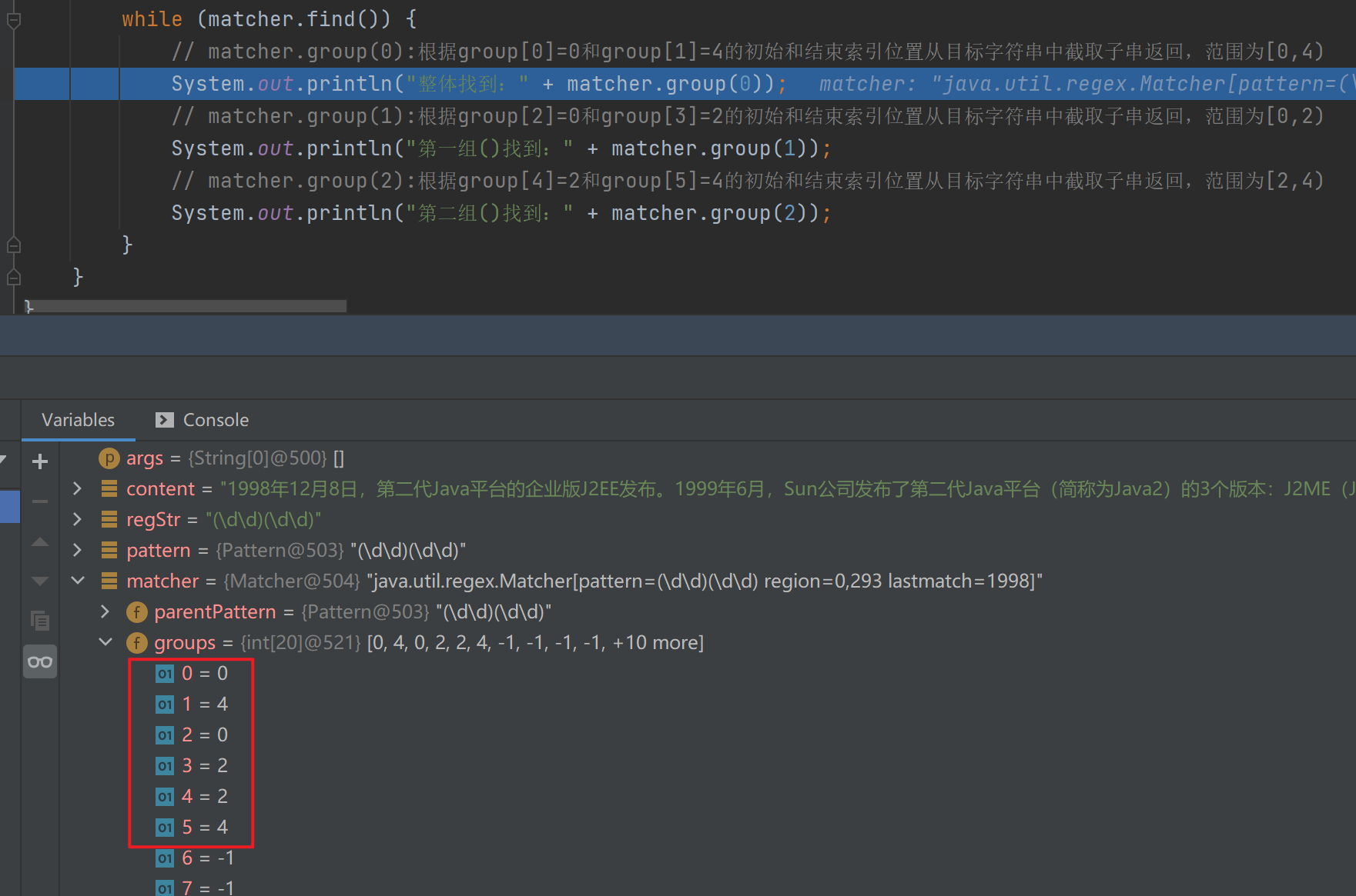 * 2.找到后将此字符串的(开始索引)和(结束索引+1)记录在matcher对象的属性int[] groups数组中,如此例子中第一个匹配到1988,那么group[0]=0,group[1]=4