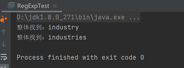方法 说明 public int start() 返回以前匹配的初始索引 public int start(int group) 返回在以前的匹配操作期间,由给定组所捕获的子序列的初始索引 public int end() 返回最后匹配字符之后的偏移量 public int end(int group) 返回在以前的匹配操作期间,由给定组所捕获子序列的最后字符之后的偏移量 public boolean lookingAt() 尝试将从区域开头开始的输入序列与该模式匹配 public boolean find() 尝试查找与该模式匹配的输入序列的下一个子序列 public boolean find(int start) 重置此匹配器,然后尝试查找匹配该模式、从指定索引开始的输入序列的下一个子序列 public boolean matches() 尝试将整个区域与模式匹配 public String replaceAll(String replacement) 替换模式与给定替换字符串相匹配的输入序列的每个子序列 PatternSyntaxException:是一个非强制异常类,它表示一个正则表达式模式中的语法错误。