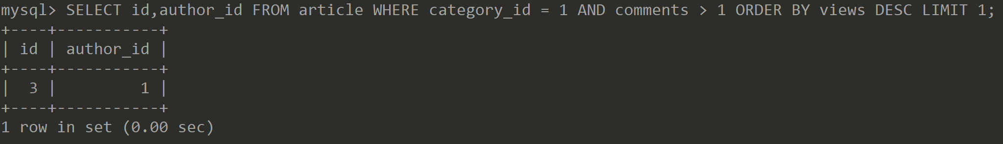 SELECT id,author_id FROM article WHERE category_id = 1 AND comments > 1 ORDER BY views DESC LIMIT 1;