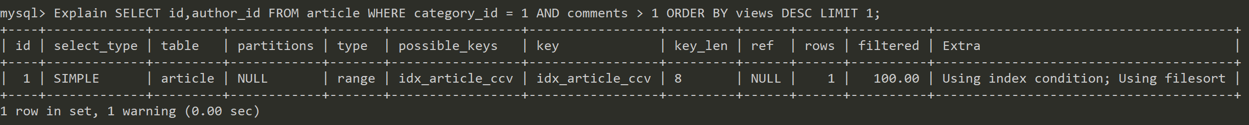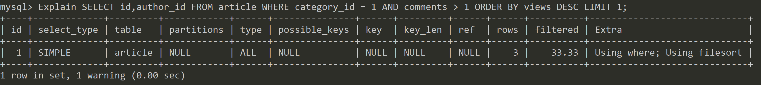 (1, 1, 3, 3, '3', '3');①假设需要查询category_id为1且comments大于1的情况下views最多的article_id,那么查询的sql语句如下: