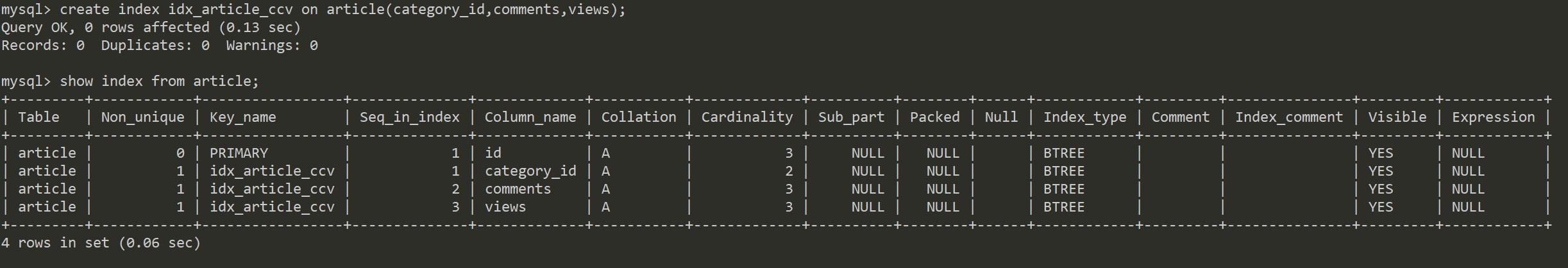 ②于是需要建立索引,先尝试在category_id、comments和views字段上建立联合索引,sql语句如下: