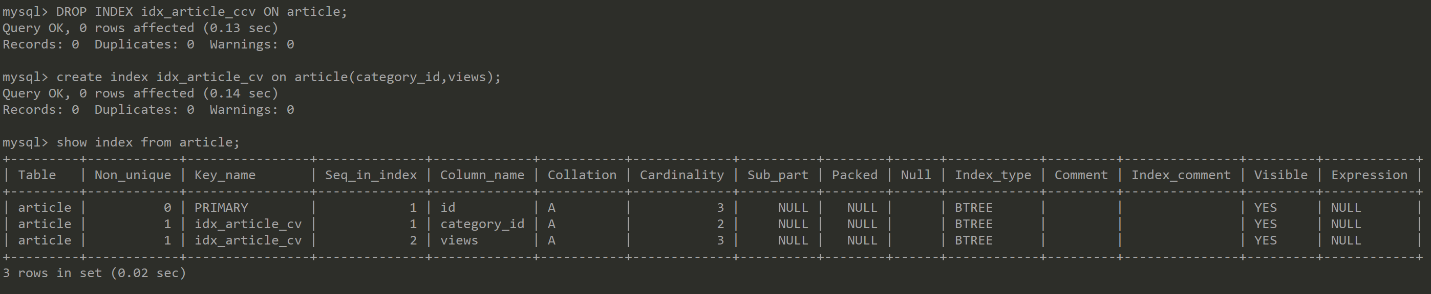 ③于是需要重新建立索引,先删除原来索引,并新建字段category_id和views的联合索引即可解决问题,sql语句如下: