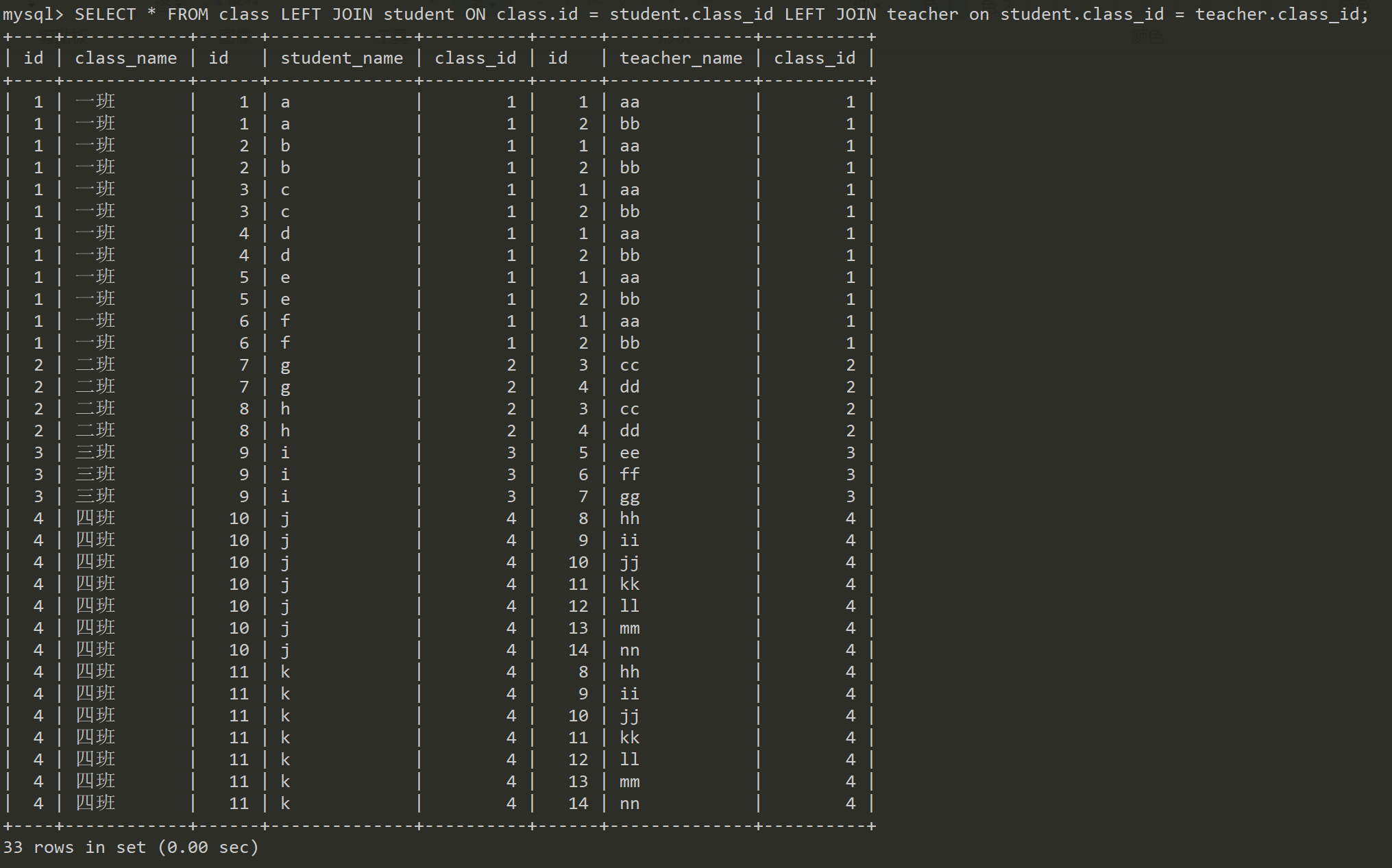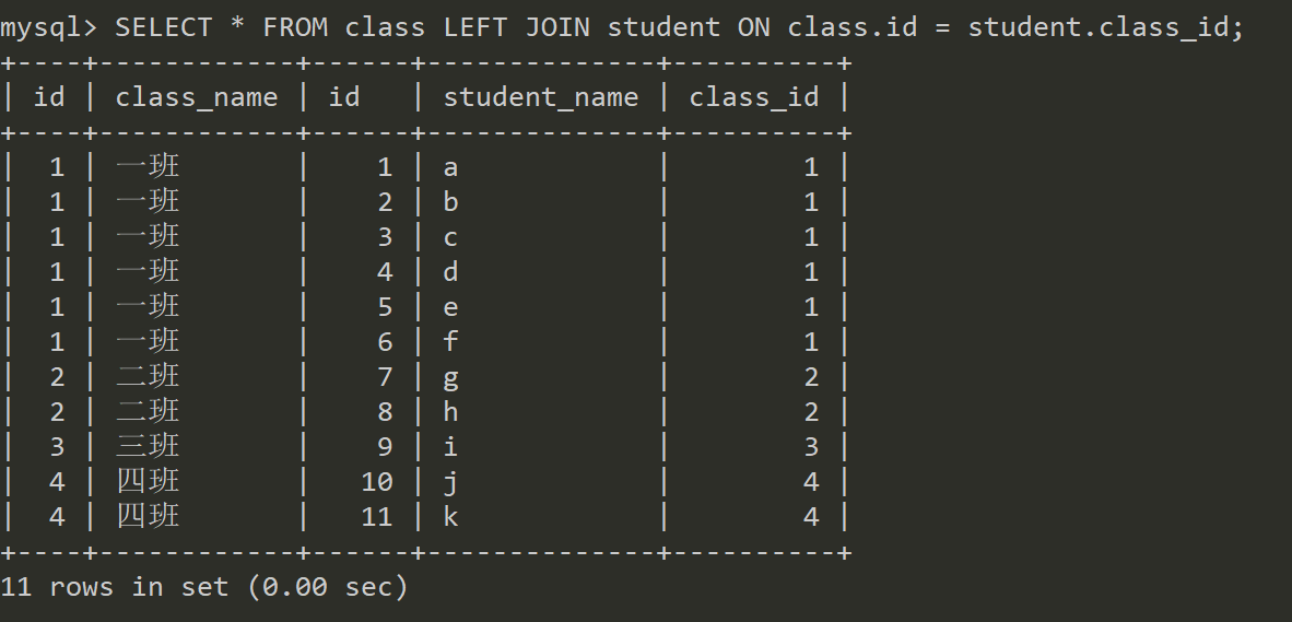 INSERT INTO student(student_name,class_id) VALUES("k",4);①假设需要列举所有班级对应的学生信息,则对应的sql语句如下: