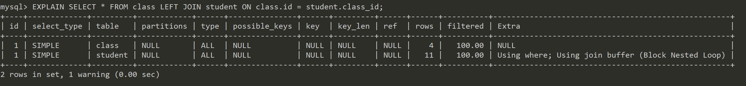 创建索引后重新查询执行计划,可以看到第二行的type变为了ref,rows也优化得比较明显。这是由左连接特性决定的,即LEFT JOIN条件用于确定如何从右表搜索行,左边一定都有,所以右边是关键点,一定需要建立索引。同理如果是右连接则左表建立索引。
