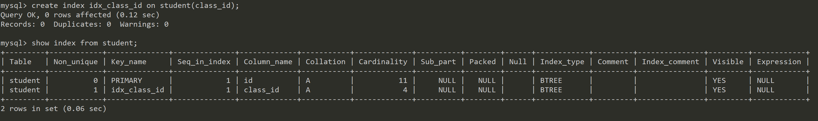 ②尝试把索引加在student表的class_id字段,sql语句如下: