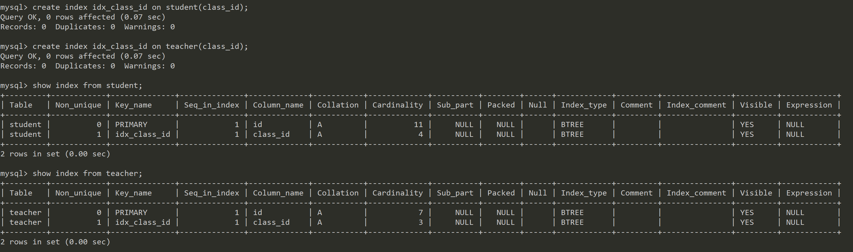 ②尝试把索引加在student表的class_id字段以及teacher表的class_id字段,sql语句如下: