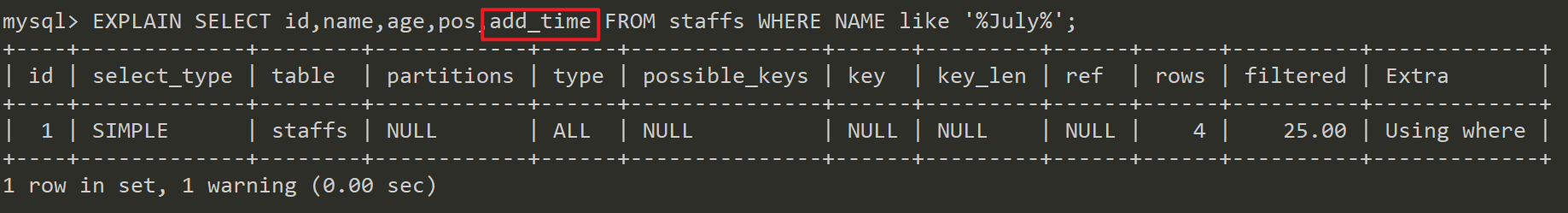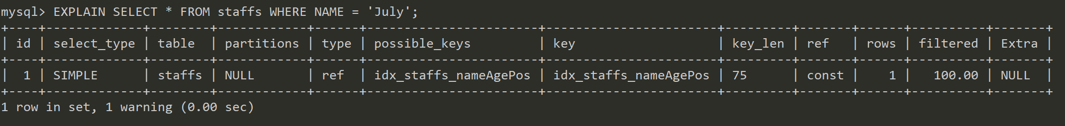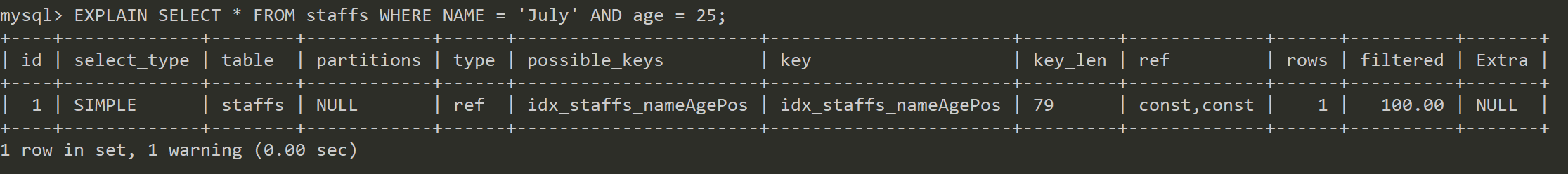 EXPLAIN SELECT * FROM staffs WHERE NAME = 'July' AND age = 25;
