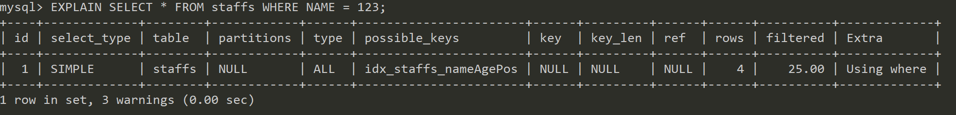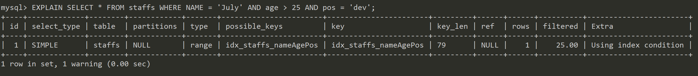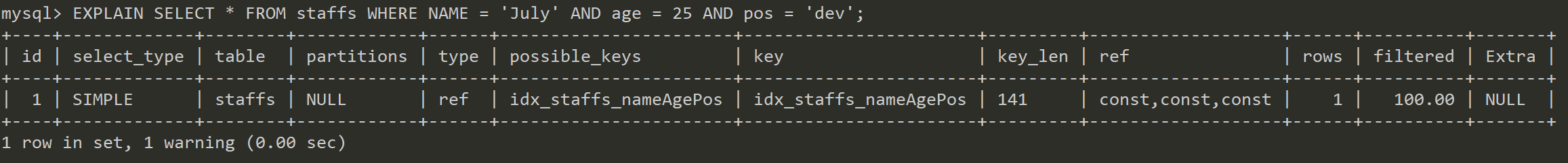 EXPLAIN SELECT * FROM staffs WHERE NAME = 'July' AND age = 25 AND pos = 'dev';