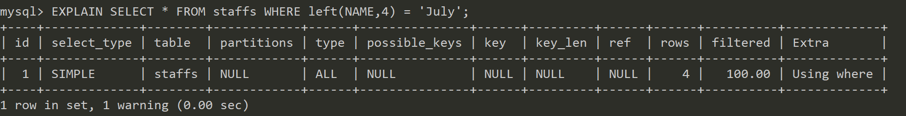 EXPLAIN SELECT * FROM staffs WHERE left(NAME,4) = 'July';