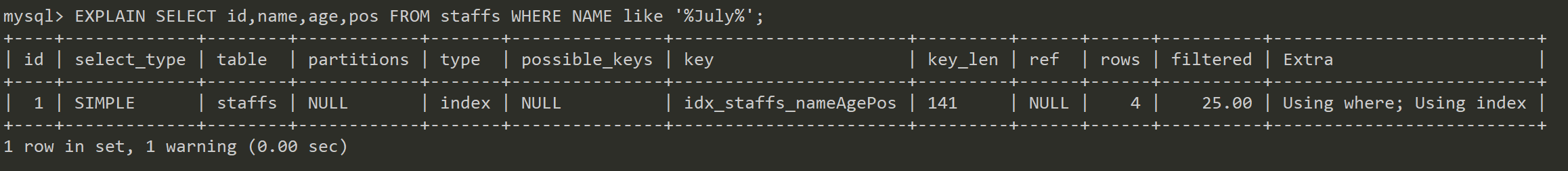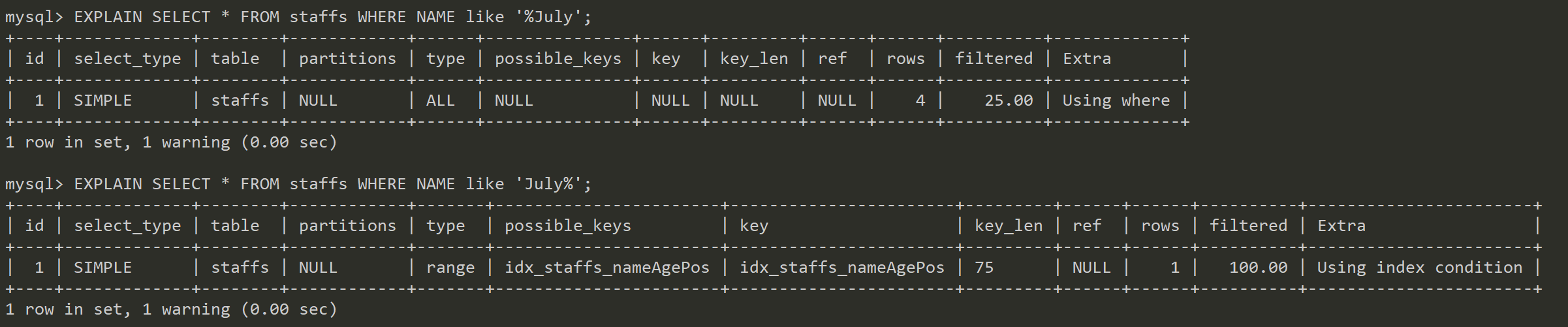 EXPLAIN SELECT * FROM staffs WHERE NAME like 'July%';