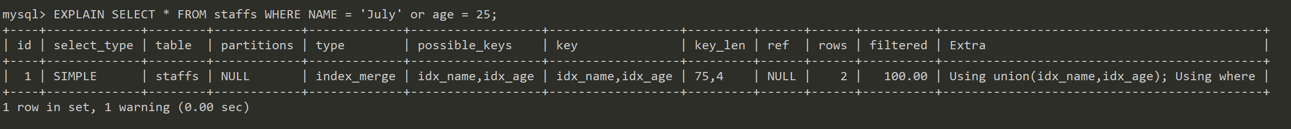 EXPLAIN SELECT * FROM staffs WHERE NAME = 'July' or age = 25;