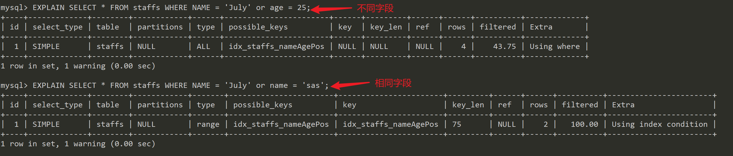 2EXPLAIN SELECT * FROM staffs WHERE NAME = 'July' or age = 25;