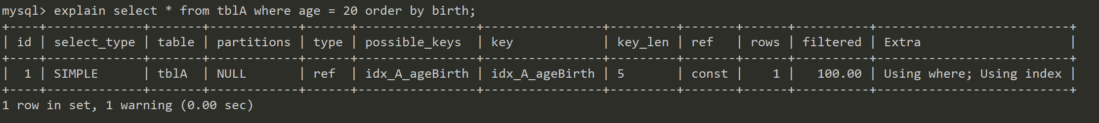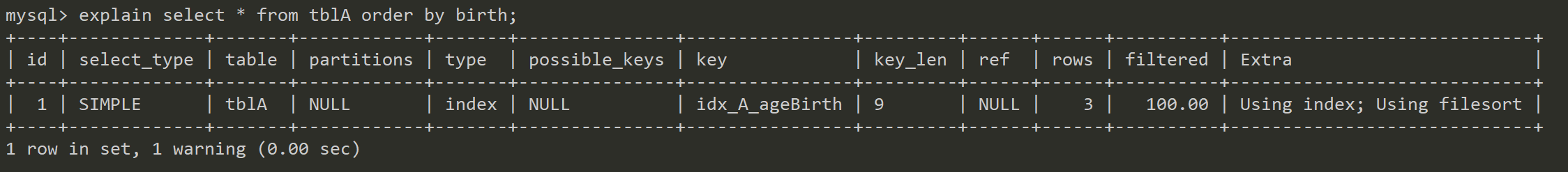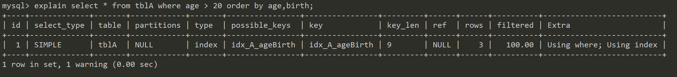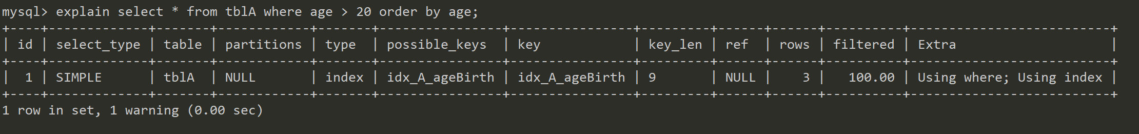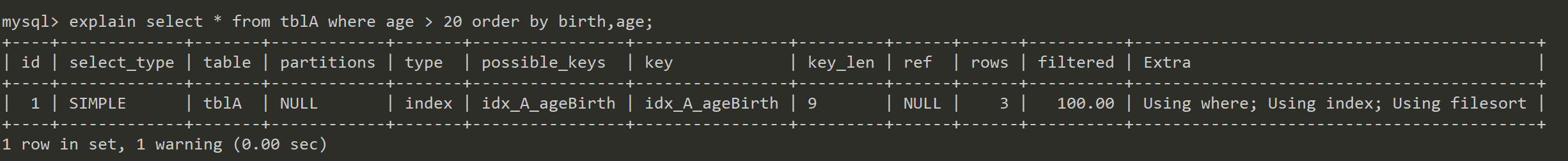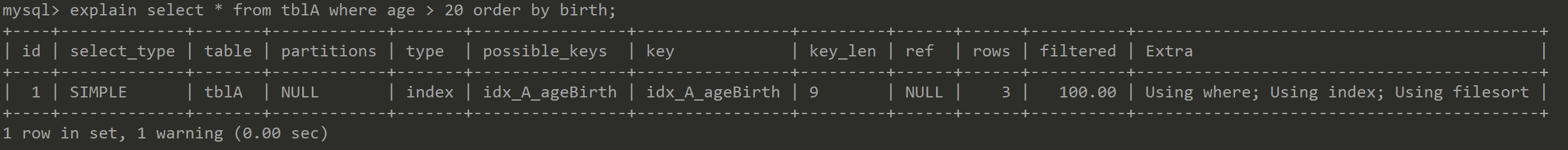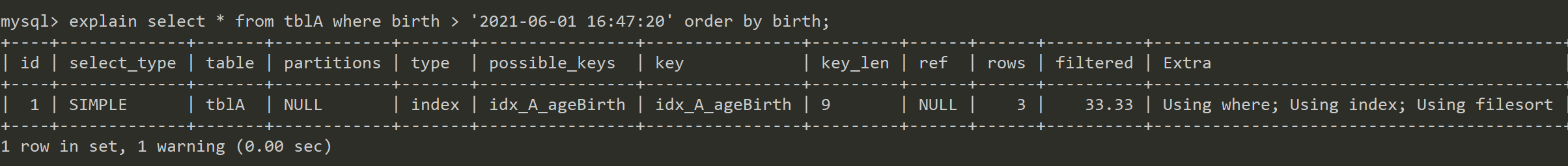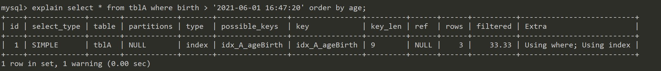 explain select * from tblA where birth > '2021-06-01 16:47:20' order by age;