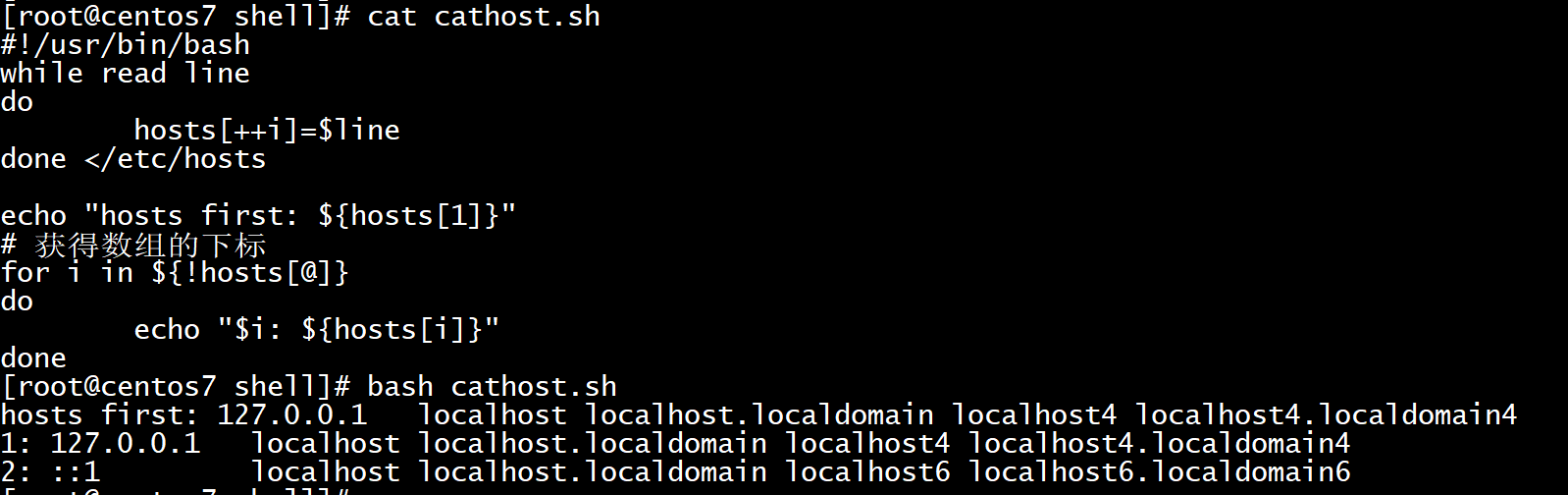 eg1:while遍历/etc/hosts文件的所有行并输出。