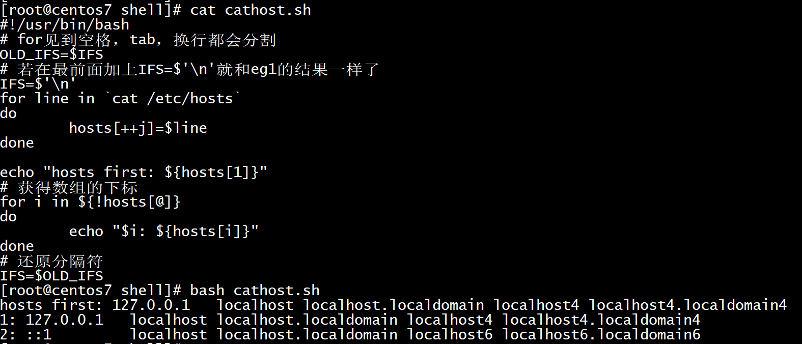 eg2:for遍历/etc/hosts文件的所有行并输出。