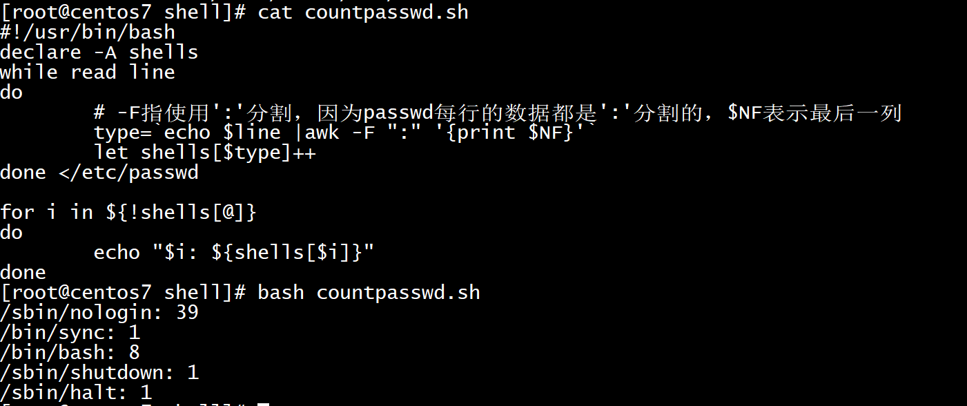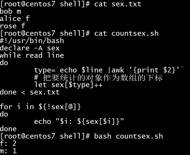 [root@centos7 shell]# declare -A info # 先要声明关联数组