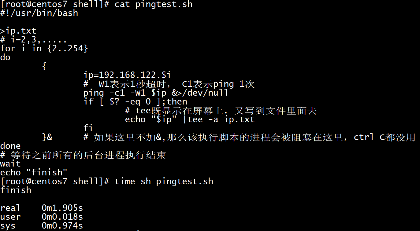 [root@centos7 shell]# time sh pingtest.sh # 执行脚本后,可以查看脚本的运行时间