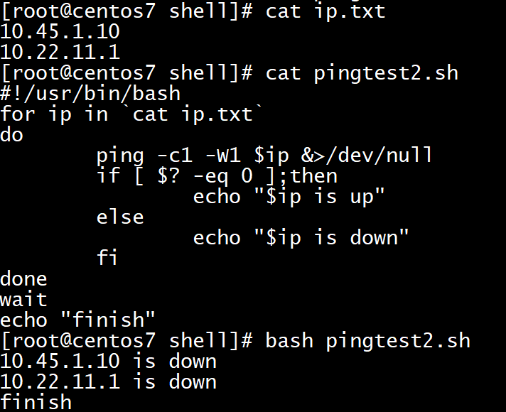 wait # 等待所有的后台进程执行结束,如果不加这里,有些ping执行不成功,就会执行echo "finish"
